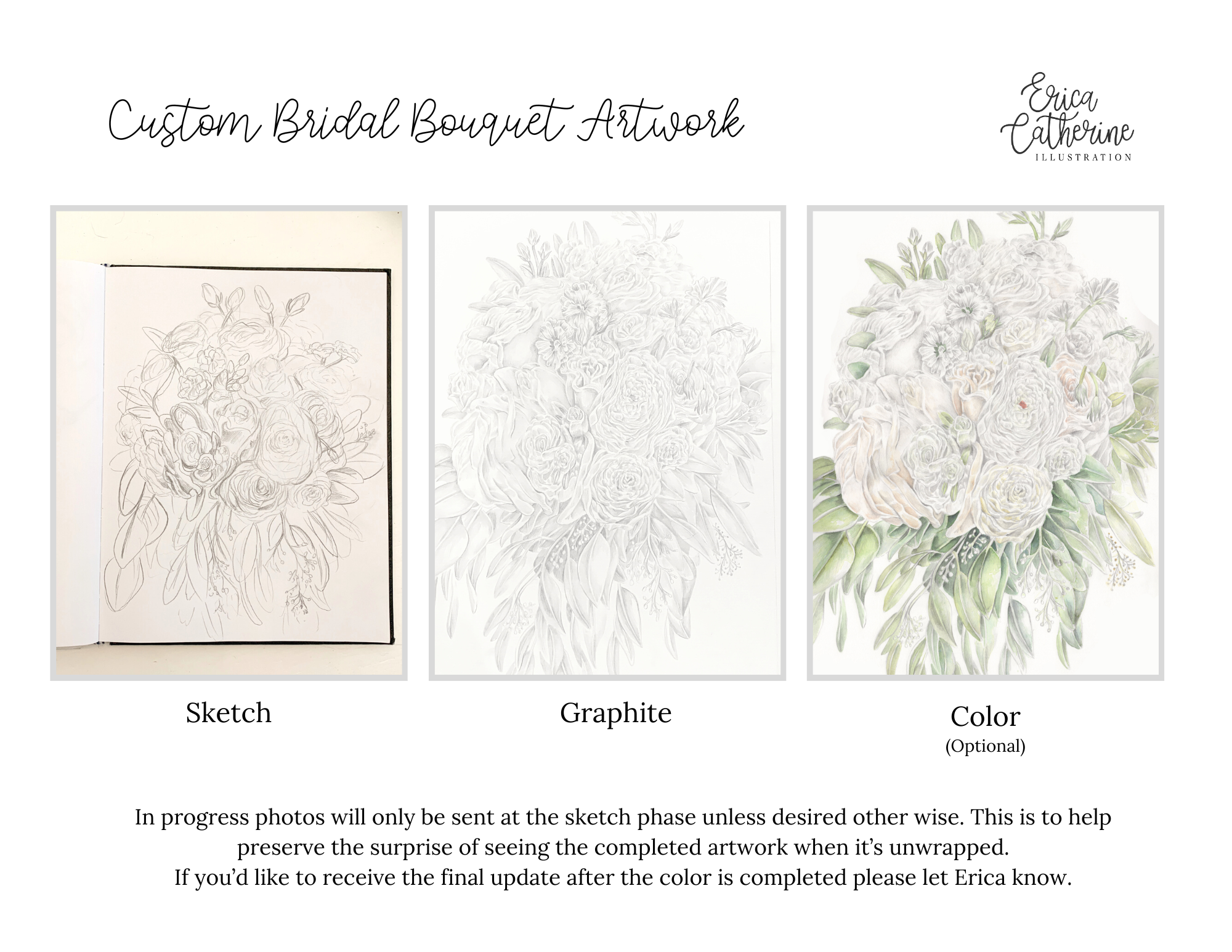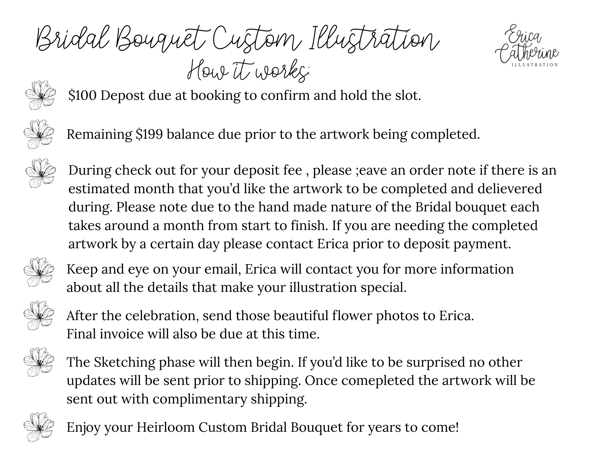 Please note that the time it will take to complete the bouquet illustration will vary from piece to piece and depend upon how what scheduling looks like. Most Bridal Bouquets will be completed in roughly one month after the photos have been sent. Due to the hand made and detail orientated nature of the Bridal Bouquets Artwork only a few openings per month are available. If you need an original artwork completed by a certain date, such as an anniversary, please contact Erica Catherine for a more accurate timeline prior to purchasing.